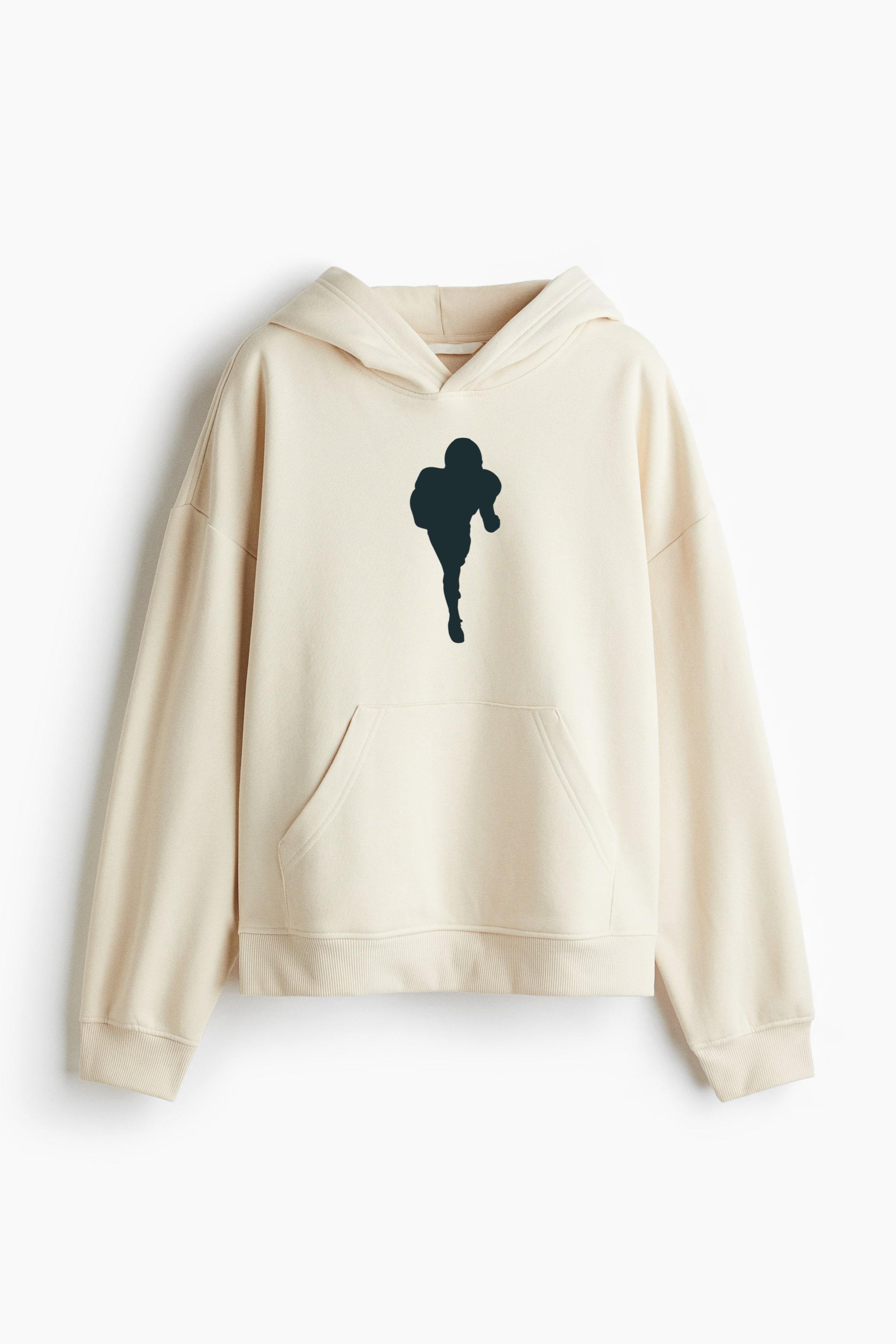 Make a bold statement in comfort with our American Football Player Blocking Silhouette Oversized Fit Printed Hoodie Oversized Fit Printed Hoodie. Crafted from a soft, medium-weight cotton blend, this sweatshirt hoodie features a graphic motif, heavily dropped shoulders, and a relaxed silhouette for effortless streetwear style.