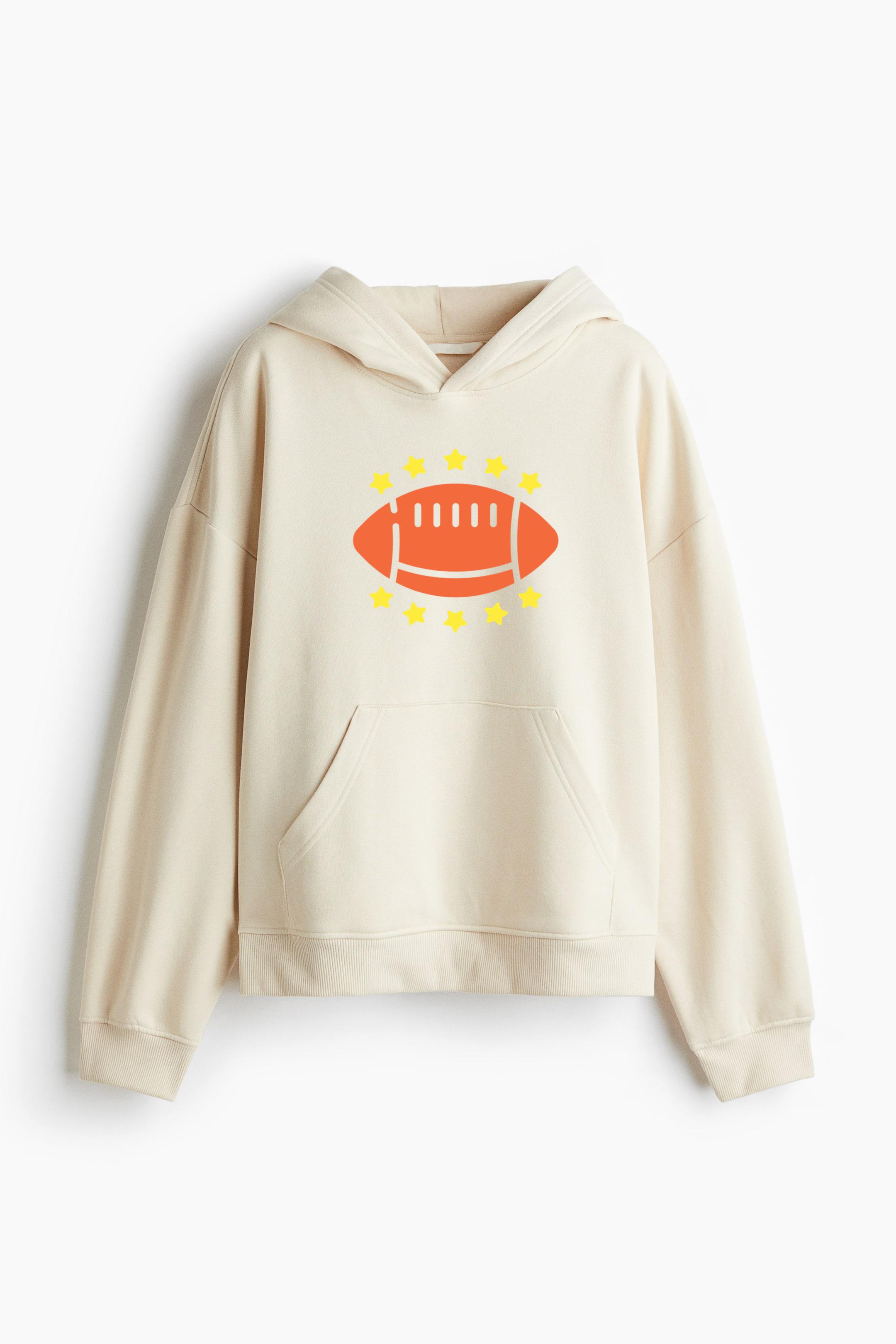 Make a bold statement in comfort with our American Football Symbol Oversized Fit Printed Hoodie Oversized Fit Printed Hoodie. Crafted from a soft, medium-weight cotton blend, this sweatshirt hoodie features a graphic motif, heavily dropped shoulders, and a relaxed silhouette for effortless streetwear style.