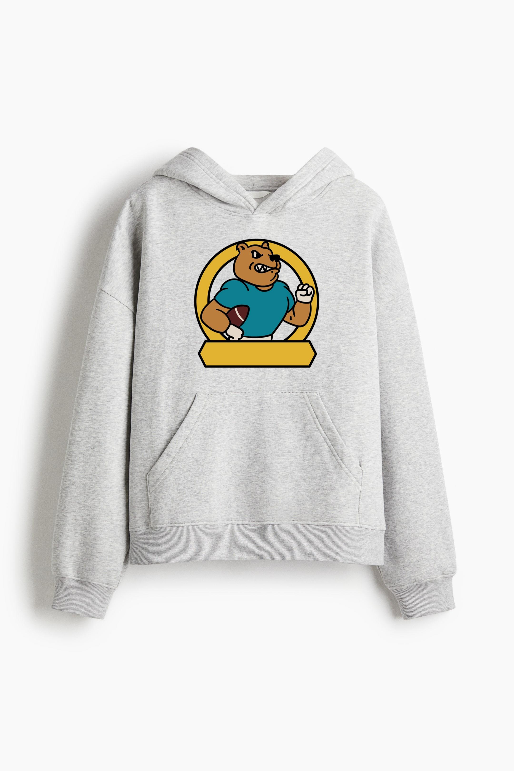 Teddy Bear Holding A Football In A Circle Oversized Fit Printed Hoodie Oversized Fit Printed Hoodie – Extra-Loose Cotton-Blend Sweatshirt with Graphic Print and Brushed Fleece Interior